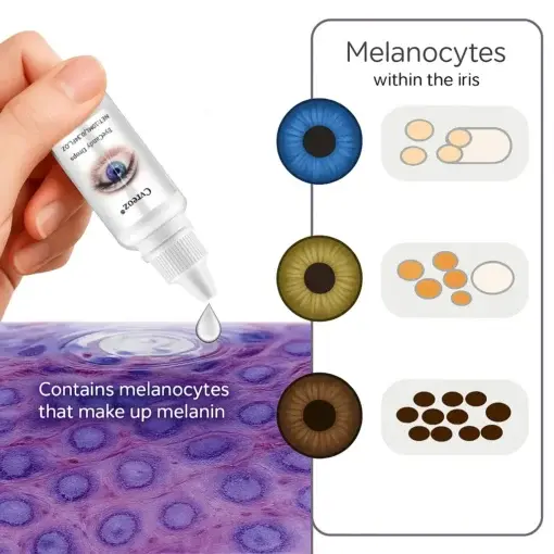 Cvreoz® EyeCandy Drops can visibly change eye color within a short period of time, specifically within 2 hours. These eye drops are designed to temporarily alter the appearance of eye color by interacting with the melanin in the iris, the colored part of the eye. The active ingredients in the eye drops may work by either inhibiting melanin production or altering its distribution within the iris, which can result in a change in the observed eye color.